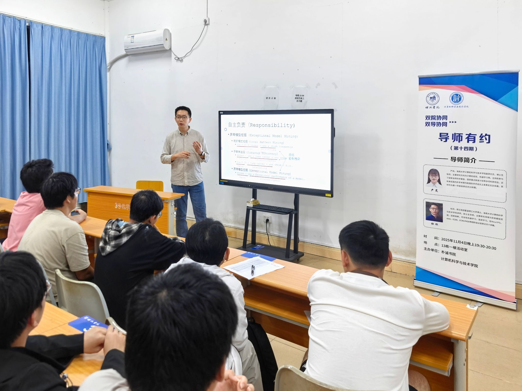 杜欣为同学们作了一场生动的学术报告,聚焦可信性机器学习的理论方法研究核心,以通俗生动的阐释,深入解析不确定性估计、因果推断等关键方向,引导新生拓展学术视野、培养专业兴趣。